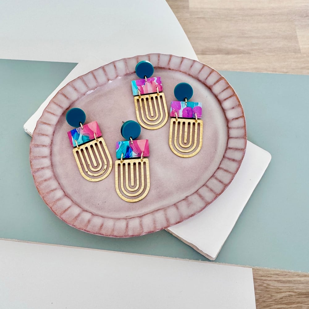 These dangles are so gorgeous on, with a dainty green stud top, unique hand-painted middle and a brass component that looks a bit like a rainbow, and catches the light beautifully.