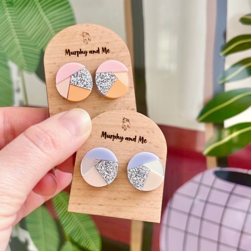 A classic shape complied of gorgeous colour combinations, pieced together in a geometric design. These studs are a little labour of love and look great as their own subtle statement but can also be accessorised with other patterns and worn every day.