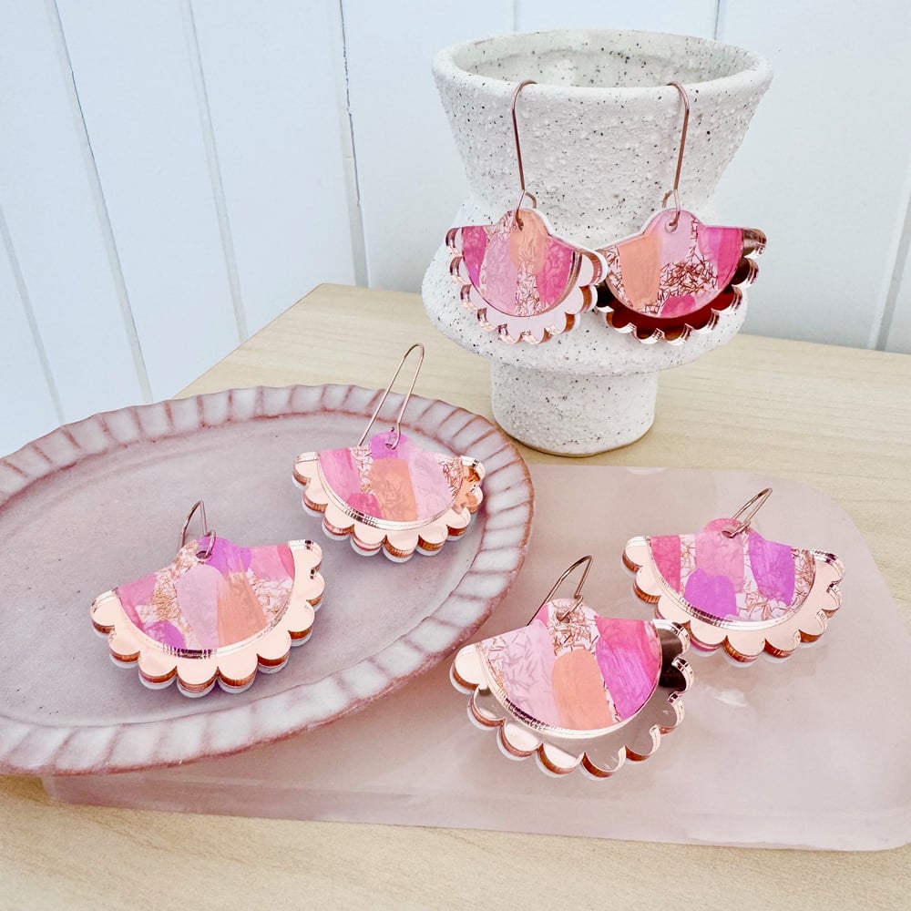 These new dangles are a beautiful statement. They sway close to the face-line with lovely movement. Made from hand painted acrylic in peachy-pink tones with pops of copper flecked glitter, a rose gold mirror frill and finished with an elegant hook drop dangle.